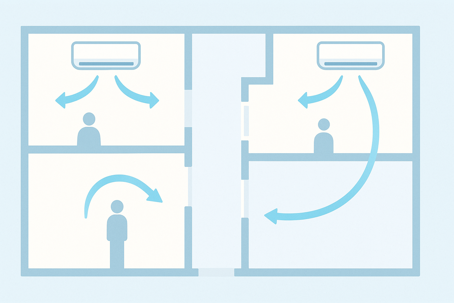 家族が同じ時間帯に別室で過ごす日が多い、二階建てで上下に生活空間が分かれている、廊下や扉で空気が途切れやすい。こうした条件では、各室で低い負荷の連続運転にすると体感が安定し、無理に1台で遠くまで冷やすより設定の上下が減ります。扇風機やサーキュレーターを天井方向へ向けて回し、エアコンの風向を水平にすると、冷気のむらが減って設定温度を下げずに済むというメーカーの解説と相性が良い運用です。