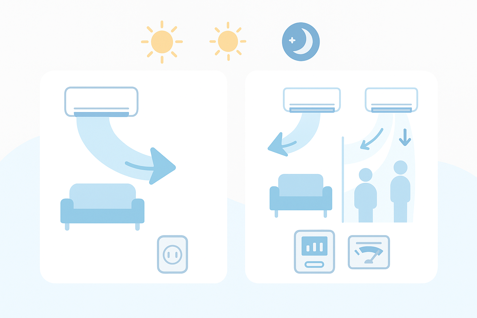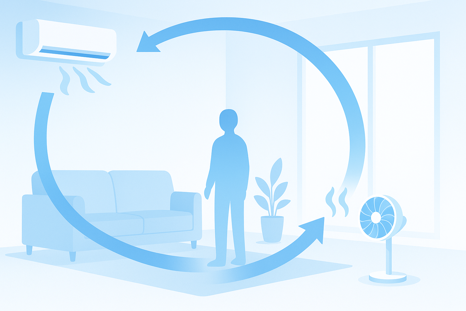空気の動かし方は難しくありません。エアコンの風向は水平、サーキュレーターは天井方向へ向け、部屋全体をゆるくかき混ぜます。メーカーはこの配置で冷気のむらが減り、設定を過度に下げなくても快適に過ごしやすいと解説しています。