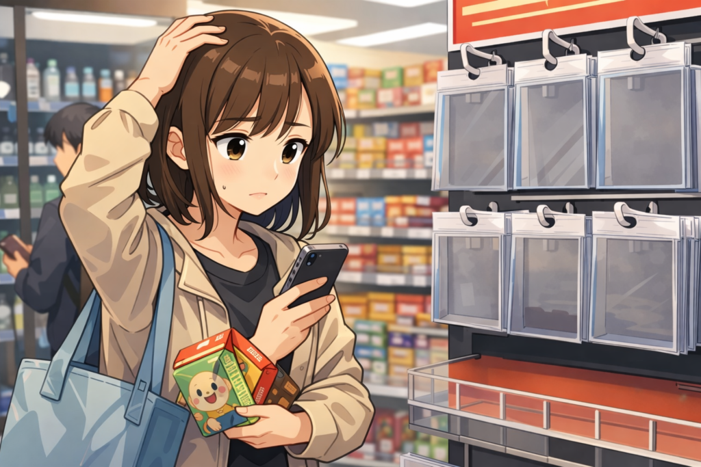 最寄りの店に行く→特典がない→次の店へ、という動きは直感的ですが、弱点が2つあります。1つ目は「特典の有無は、外から分からない」こと。入口に告知があっても、特典はすでに終了していることがあります。2つ目は「店ごとの開始タイミングがズレる」こと。開始直後に行っても、まだ売場に出ていないだけで“無い”と判断してしまうケースが出ます。結果として、当たり店舗を外してしまい、ムダ足が増えます。