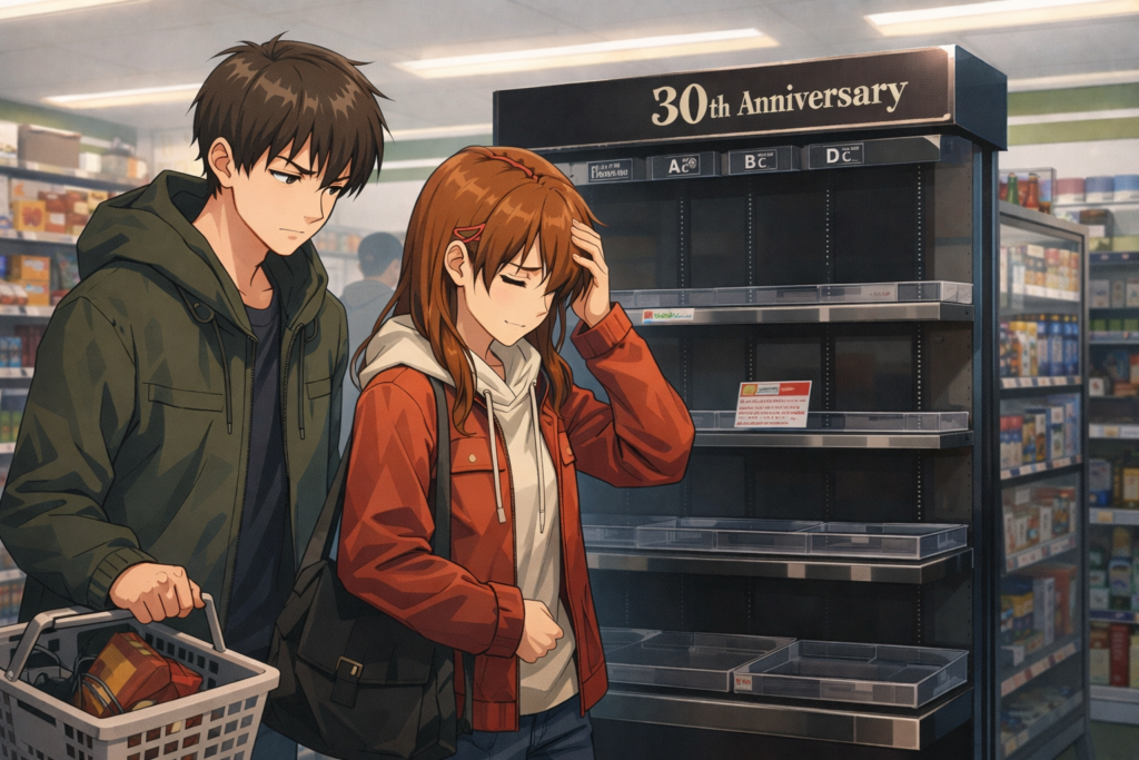 加えて今回は“30周年”の記念弾です。記念弾は「今回は引いておきたい」「節目だから手元に残したい」という動機を自然に増やします。ライト層が一回だけ引く割合が増えると、店舗の在庫は読みにくくなります。一方でコレクター層は、上位賞(特にフィギュア)を狙って回数が伸びがちです。このライト層とコレクター層が同時に動くと、店頭在庫は短時間で薄くなります。