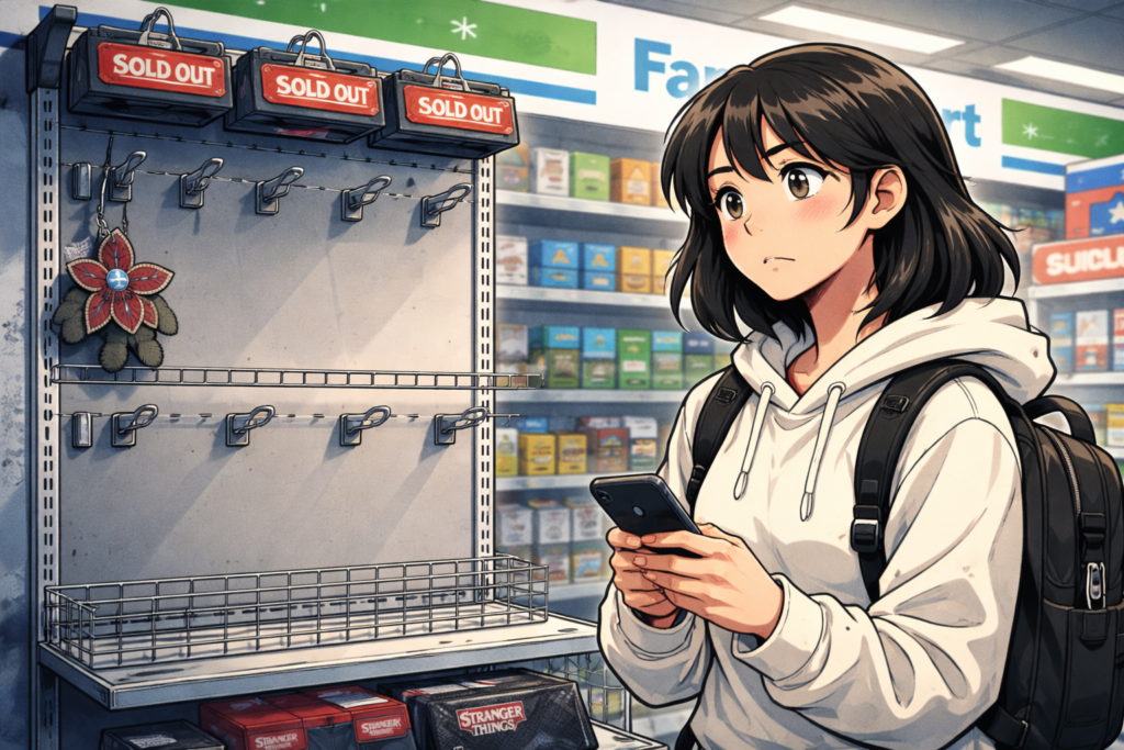 ストレンジャー・シングスのファミマコラボは、話題性と実用性が強い一方で、数量限定かつアイテム別に取扱店舗数が異なります。さらに店舗ごとに数量も薄く、発売日・時間も揃いません。この条件が揃うと、「普通に探す」ほど外れやすいのが現実です。