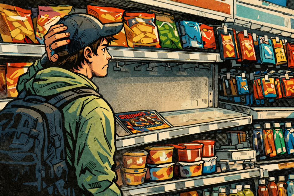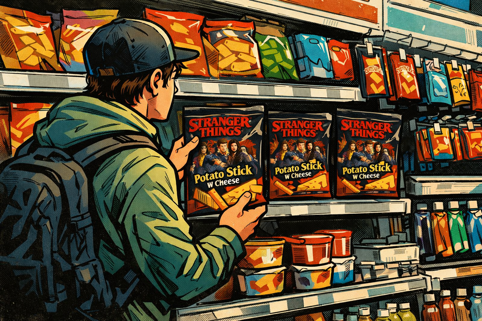 もう一段、市況として押さえておきたいのが、作品側の盛り上がりです。ファミリーマートは同時期に『ストレンジャー・シングス 未知の世界』とのコラボを「ブランド史上最大規模」として展開し、コンビニエンスウェア(アパレル)や文具なども数量限定で販売しています。話題が強い時期は、菓子も「ついで買い」ではなく「目的買い」になりやすく、夕方までに棚が薄くなる(または入荷してもすぐ動く)状況が起きやすいと考えられます。