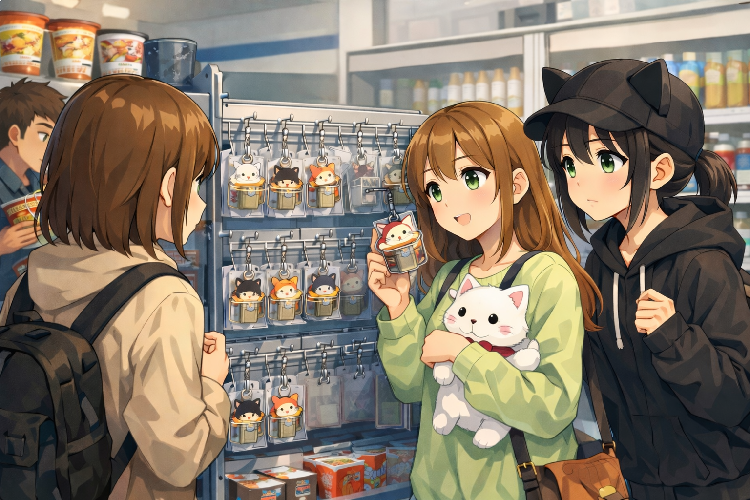 ポイントは、作品モチーフ(ラーメン屋の道具)とキャラクターの表情が、短い視認時間でも伝わることです。コンビニのレジ横や棚前で、グッズをじっくり選べない状況でも、「かわいい」「欲しい」が一瞬で立ち上がるデザインは強いです。