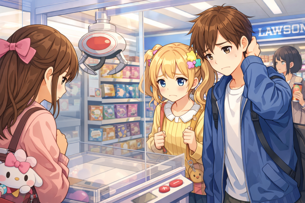 ただし、この商品は棚商品ではありません。ローソン店内のクレーンゲーム等で展開される“プライズ”です。つまり、見つける導線が独特になります。棚商品なら、店に入ってコーナーを見ればある・ないがすぐ分かります。しかしプライズは、景品が機械の中に入っていることもあれば、機械の横に見本として置かれていることもあります。さらに、同じ店舗でも「入っているが見本が目立たない」「一部だけ残っている」「一時的に別景品に切り替わっている」など、見え方がブレやすいのが難点です。