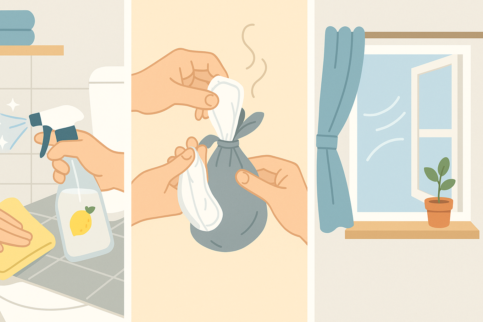 使用済みパッドは汚れた部分を内側にして丸め、ビニール袋の口をしっかり縛って廃棄し、室内の臭いの拡散を抑えます。また、トイレや浴室のアンモニア臭は、尿が原因であるため、日々の換気も重要です。