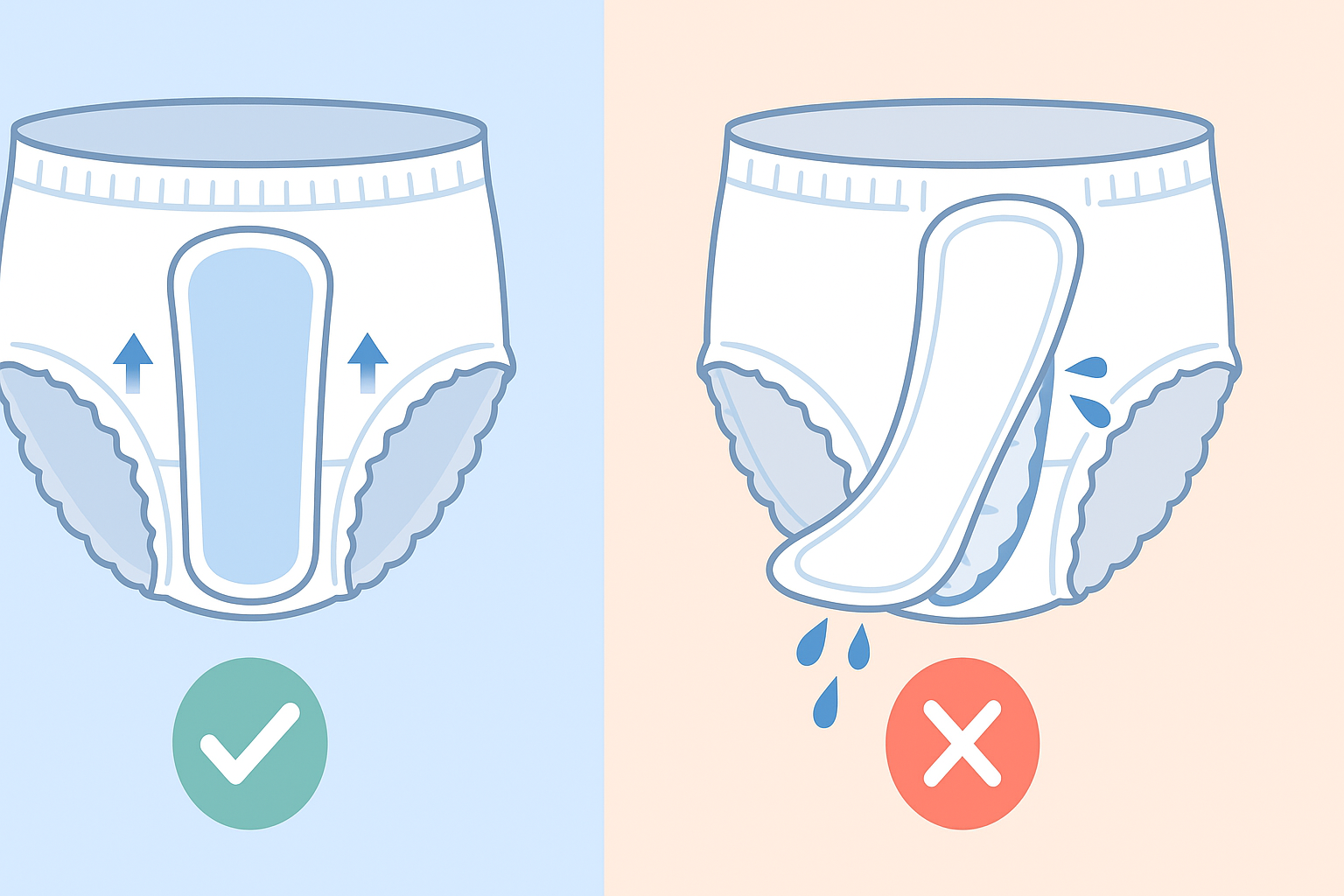 パンツタイプには、パンツタイプ専用の吸水パッドである「紙パンツ用パッド」を使用します。紙パンツ用パッドにはズレ止めテープが付いており、動いてもズレにくいのが特徴です。 - 正しい装着手順の確認(修正反映):