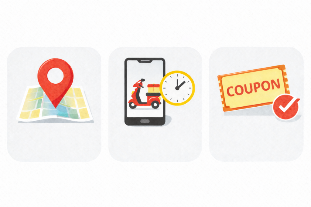 同じ料理でも、時間帯や混雑で到着目安が変わります。配達料やサービス料などの追加料金も合わせて見て、今日の許容範囲かを判断します。ここで一度、最低注文金額も見ておくと安心です。クーポンがあっても、最低注文金額に届かないと使えないことがあります。 - クーポンの条件を最後に見る