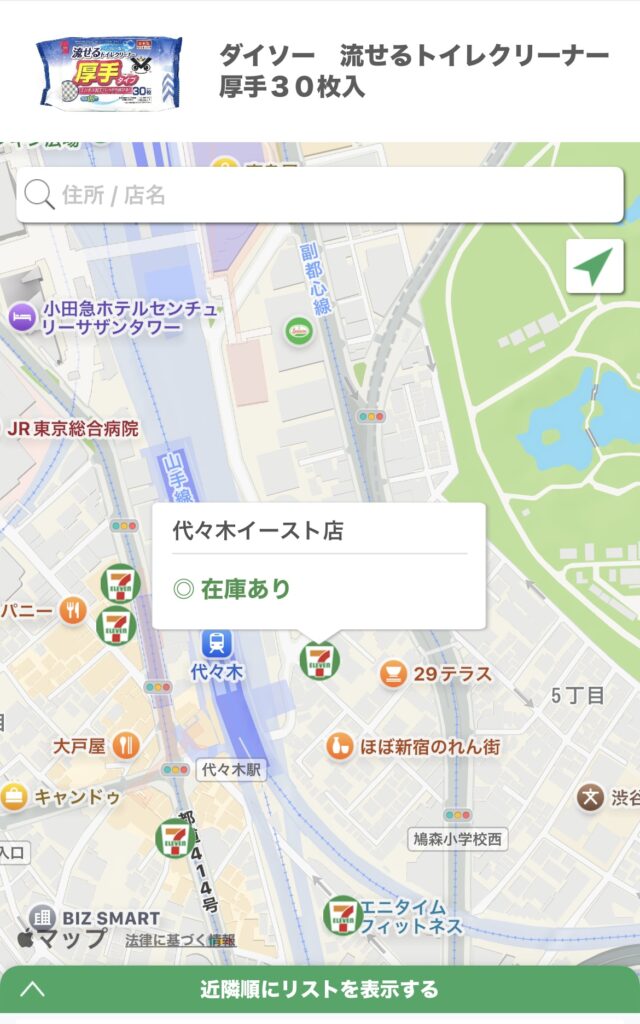セブンイレブンのアプリには商品検索機能がついています。検索すると、商品在庫がおいてある最寄りの店舗を確認することができます。