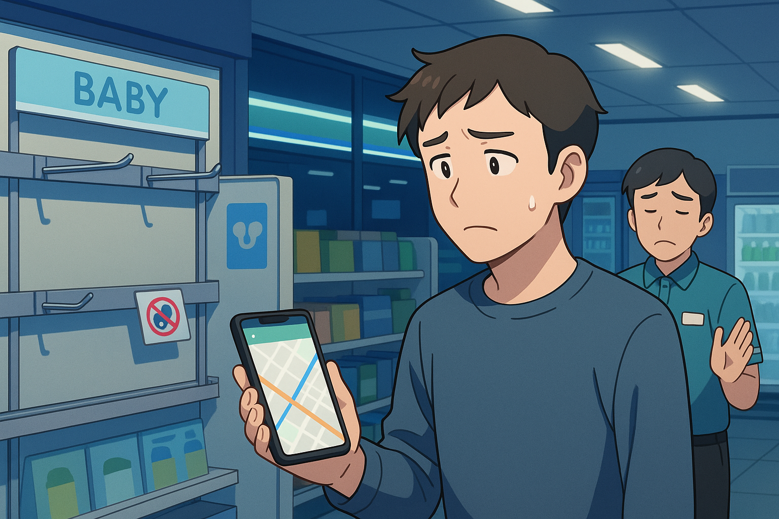 コンビニを使う場合も、行って探すのではなく、必ず電話で在庫を確かめます。「ベビー用のおしゃぶりは在庫がありますか。ひとつで構いません。」と短く伝えます。メーカーの指定はしません。緊急時は、ひとつでもあるかどうかが最優先だからです。売場の位置も電話で聞いておくと、到着直後に迷わず手に取れます。