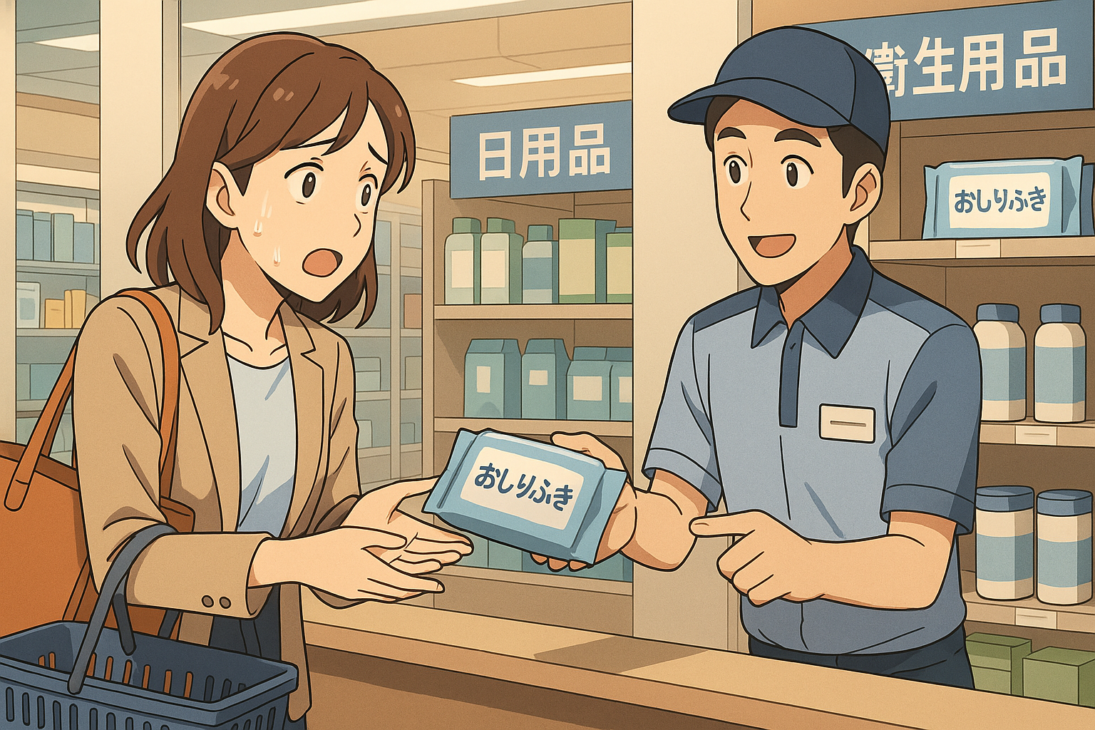 この流れは、電話確認だけはなく多角的な方法で商品を探す手順です。アプリやサイトの表示で目星をつけ、現地では商品を確認します。店員さんへの声かけは簡潔で十分です。「おしりふき、もしくはノンアルコールのウェットティッシュはどの棚ですか」。必要があれば「流せないタイプでも構いません。フタ付きがあればそちらを優先したいです」と続けます。