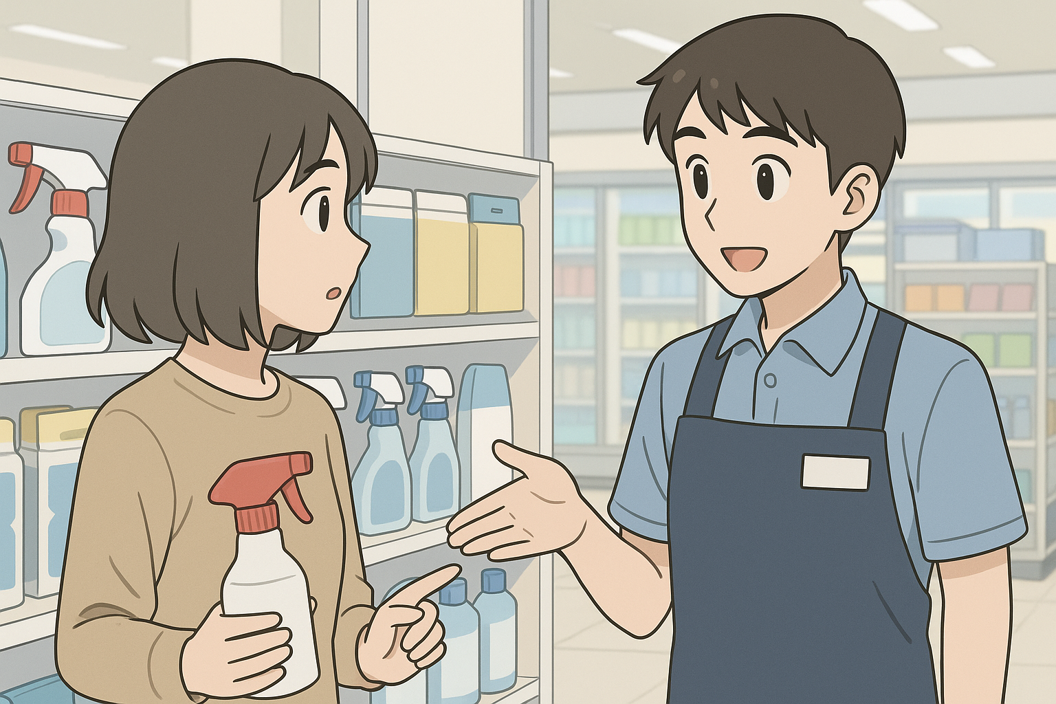 「カビキラー」の銘柄名だけでなく「塩素系のカビ取りスプレー」と用途を伝えると、別銘柄の在庫を案内してもらえる可能性が高まります。