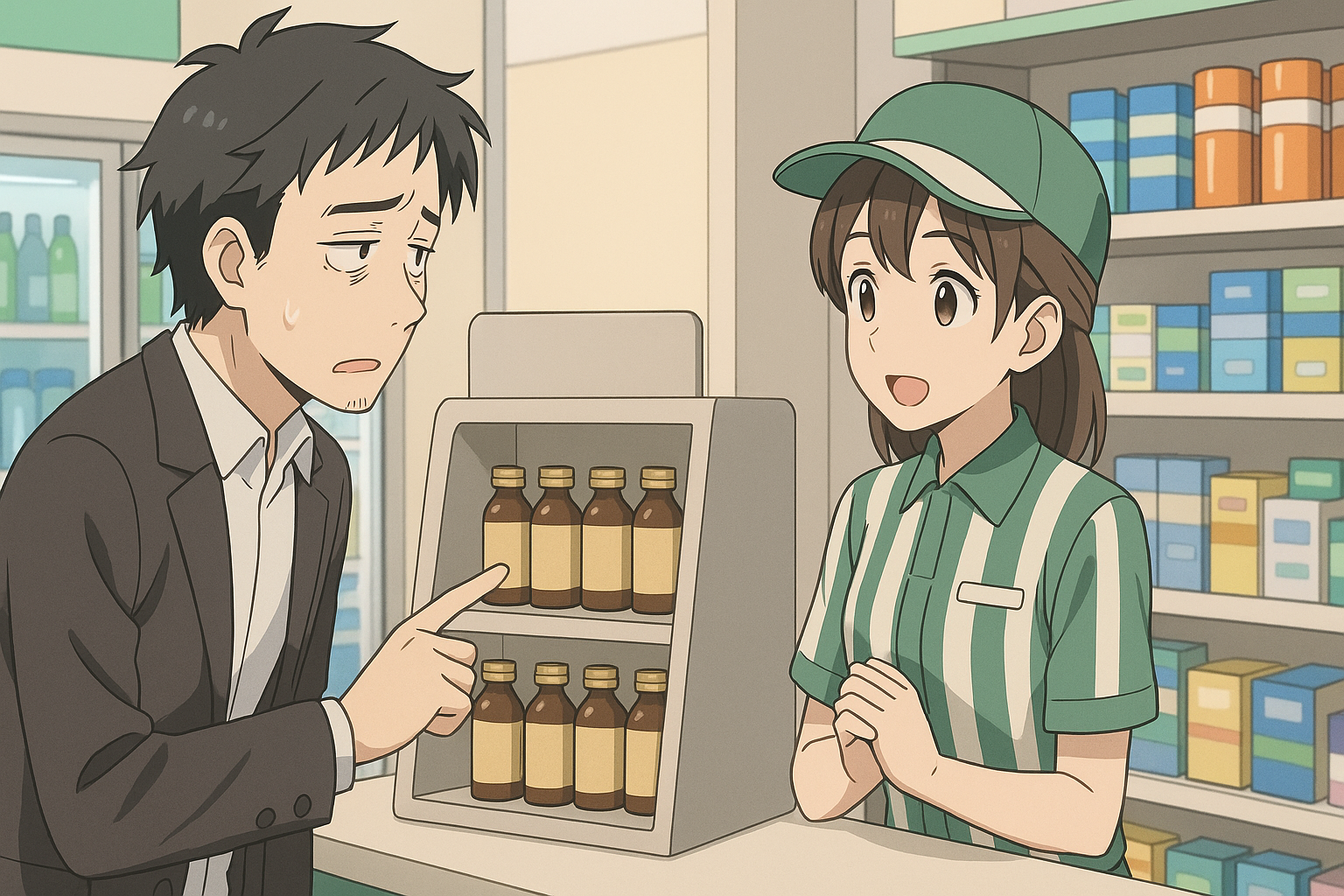 店内では、レジ横か医薬品棚の付近に、瓶入り栄養ドリンクが数種類並んでいることが多いです。ユンケル以外にもタウリン配合ドリンクなどが置かれているので、代わりになるものを選ぶという考え方もできます。