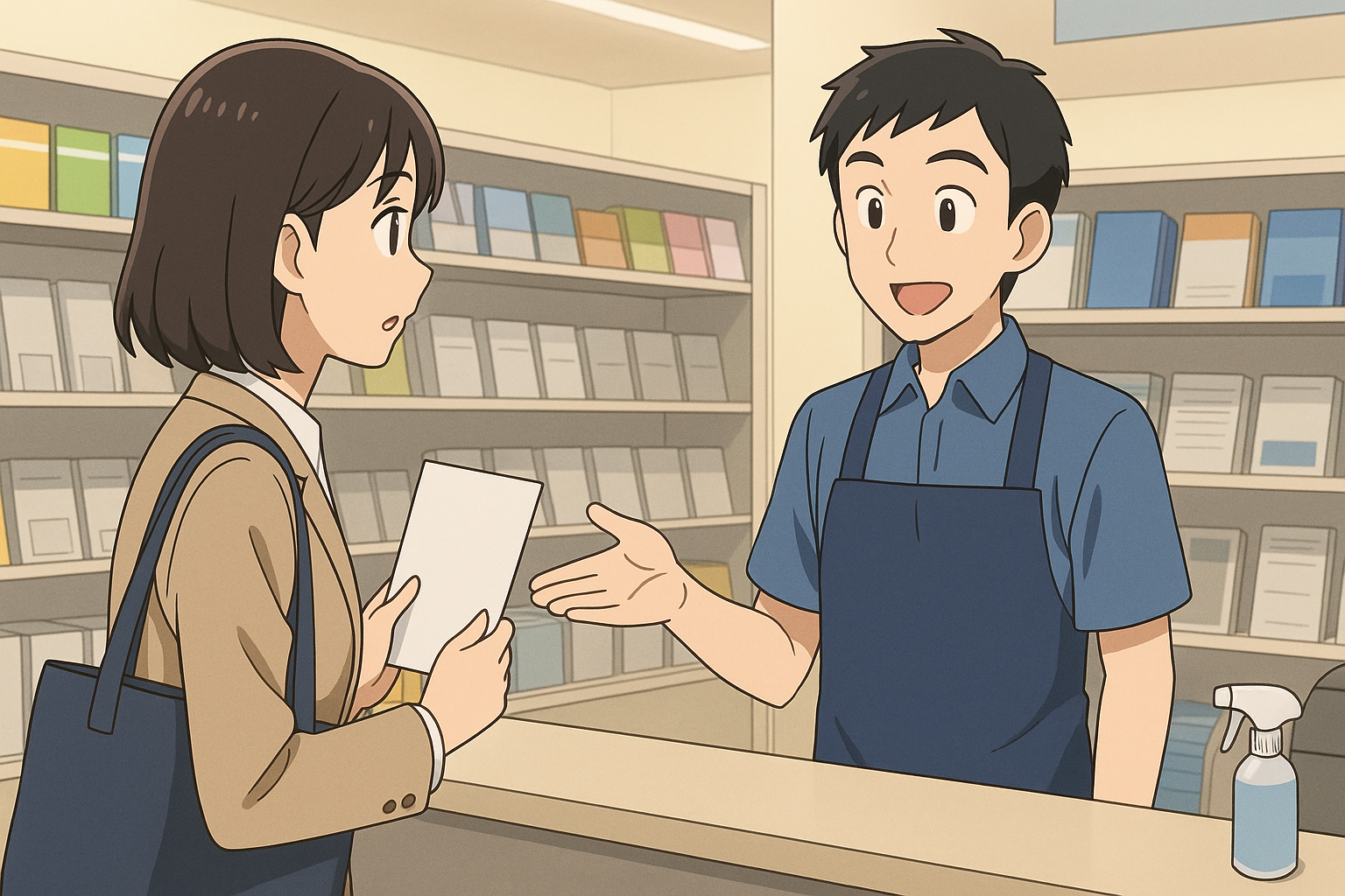 在庫ありと確認できた店舗に着いたら、文具コーナー周辺を中心に探します。履歴書は、ノートやコピー用紙、封筒、ファイル類の近くに並んでいることが多いです。