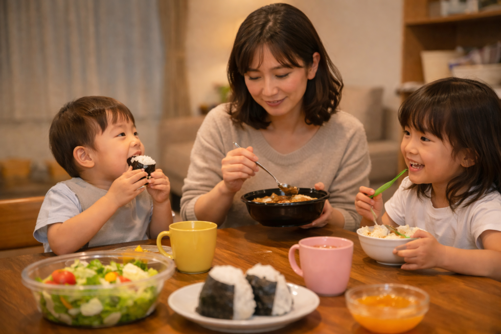 特に子ども向けは、おにぎりやパン、ゼリー・果物など“定番”に寄せると安全運用がしやすく、親の体力も守りやすくなります。今日は作らない判断で大丈夫です。夜を回せたら、それだけで合格です。