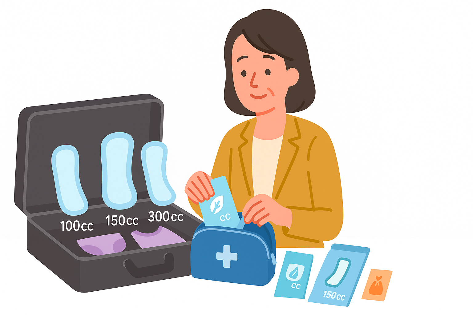 20ccの薄型(日常のちょいモレ)と、80ccの安心中量用(急な会議や残業に備えた保険)。 - 長距離移動セット: