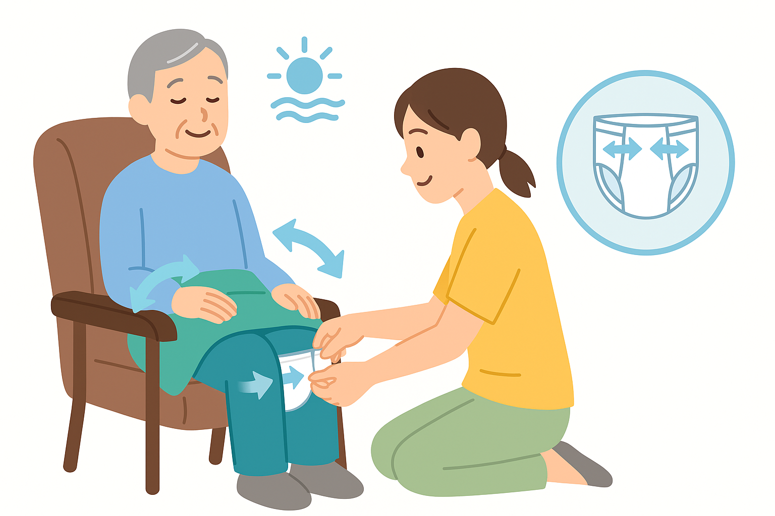介護を受ける方が男性の場合、一般的に男性器を下向きに収めたほうが尿モレしにくいとされています。上向きに固定してしまうと、尿がおなか側からモレやすくなる可能性があります。 - 正しい交換タイミング: