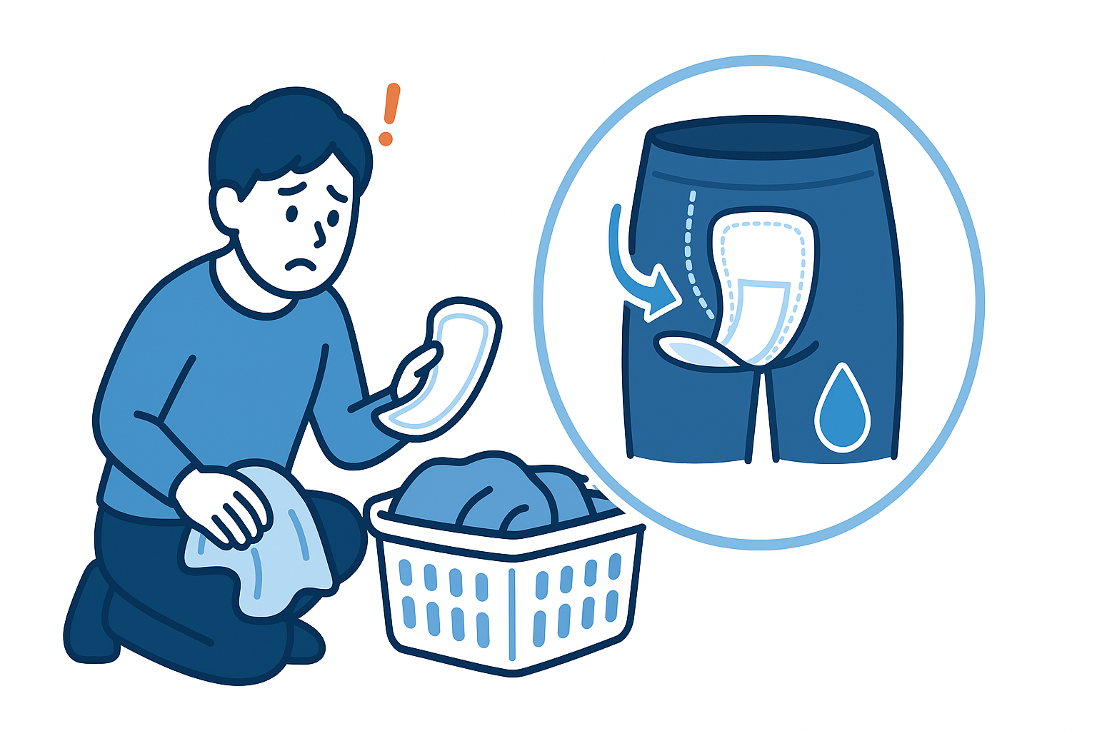パッドをセットする際、立体ギャザーをしっかり立たせ、脚の付け根に沿うように着用することが重要です。ギャザーが内側に倒れていると、横モレ防止の堤防としての役割を果たしません。 - 男性器の向き: