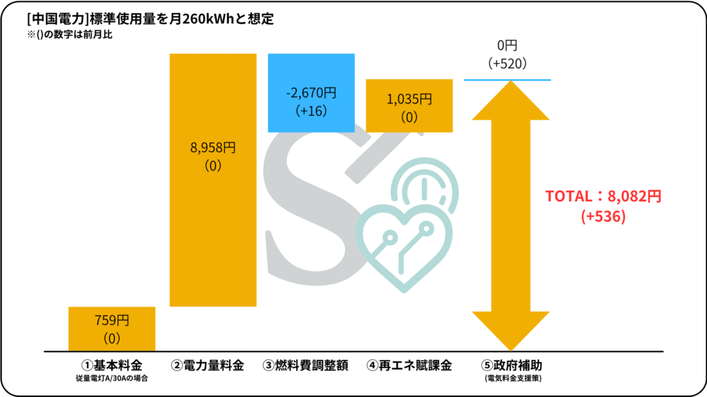 中国電力の10月使用分(11月請求分)の電気代を9月使用分と比較すると、TOTALで536円、前月より電気代が高く請求されることになります。