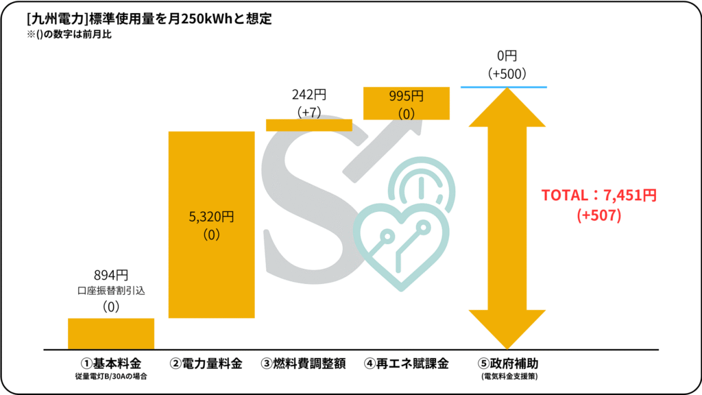九州電力の10月使用分(11月請求分)の電気代を9月使用分と比較すると、TOTALで507円、前月より電気代が高く請求されることになります。