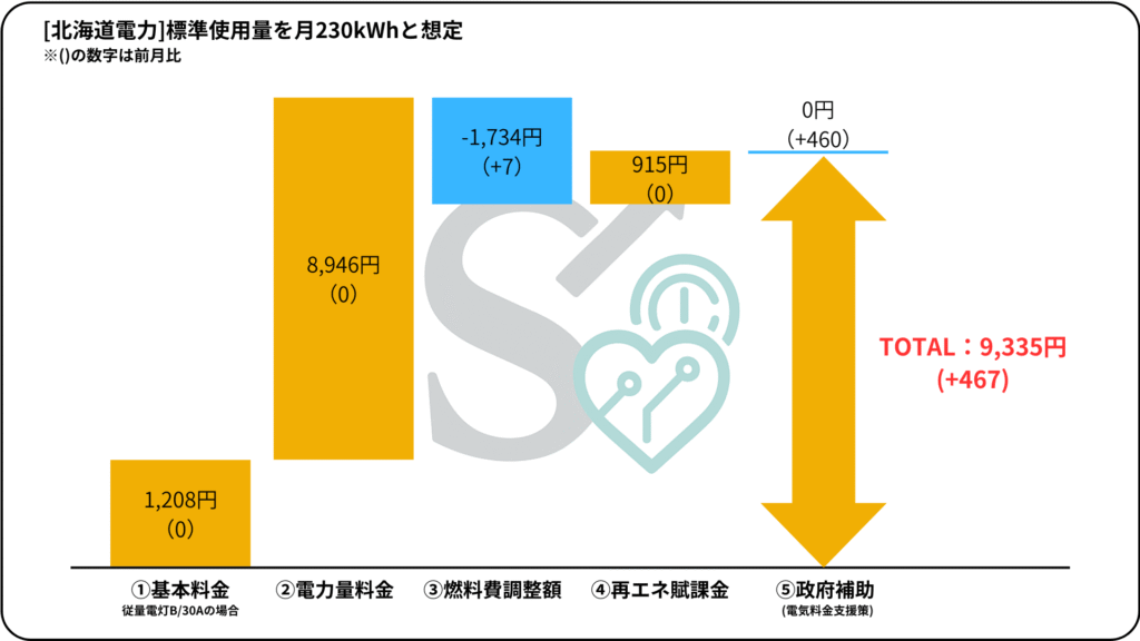 自宅の影響をざっくり見積もると、使用量が同じ前提では前月差は使用量×2円に燃料費調整単価の前月差を足し引きすれば把握できます。例えば標準的な260kWhの世帯なら補助終了分だけで約520円、北海道の230kWhなら約460円が目安で、ここに燃料費調整の数十円規模の差がのります。