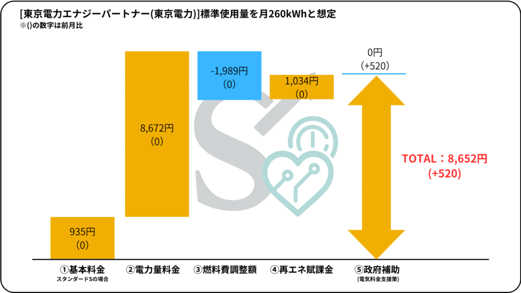 東京電力エナジーパートナーの10月使用分(11月請求分)の電気代を9月使用分と比較すると、TOTALで520円、前月より電気代が高く請求されることになります。