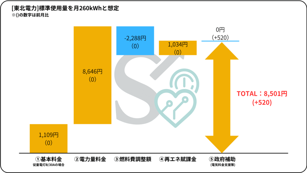 東北電力の10月使用分(11月請求分)の電気代を9月使用分と比較すると、TOTALで520円、前月より電気代が高く請求されることになります。
