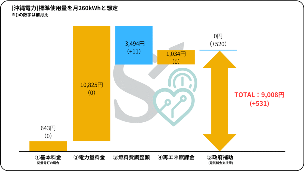 沖縄電力の10月使用分(11月請求分)の電気代を9月使用分と比較すると、TOTALで531円、前月より電気代が高く請求されることになります。