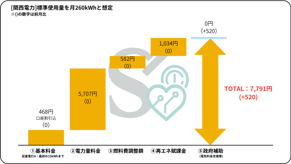 関西電力の10月使用分(11月請求分)の電気代を9月使用分と比較すると、TOTALで520円、前月より電気代が高く請求されることになります。